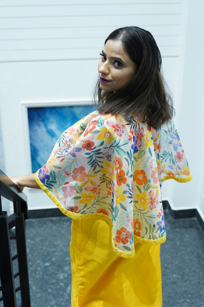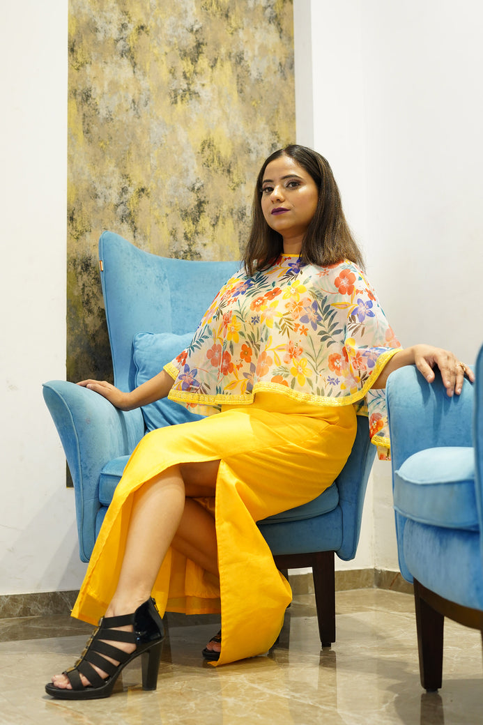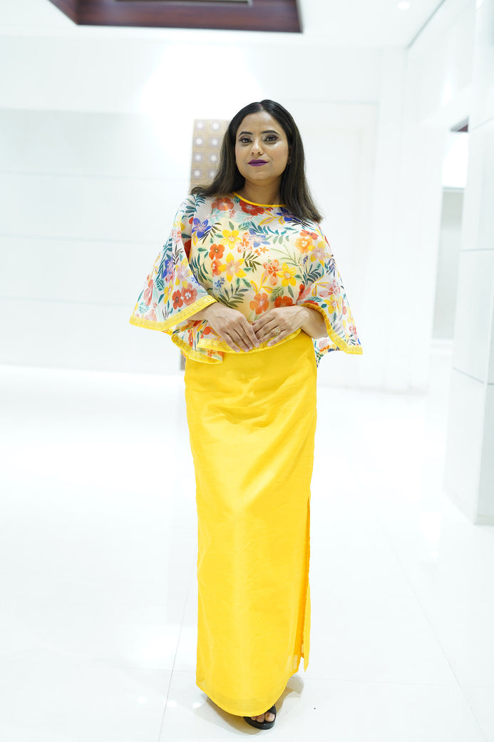 Pump up your fashion with this yellow body hugging dress from the label Chaitasri. Featuring a printed organza Poncho. Club it with high heels and Clutch to attract the Mob.At Chaitasri, all products are made with utmost care, ensuring strict quality control. As all styles are made-to-order, we do not accept returns.