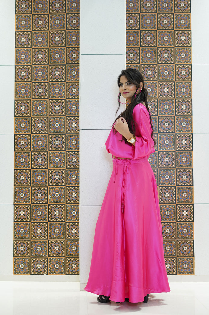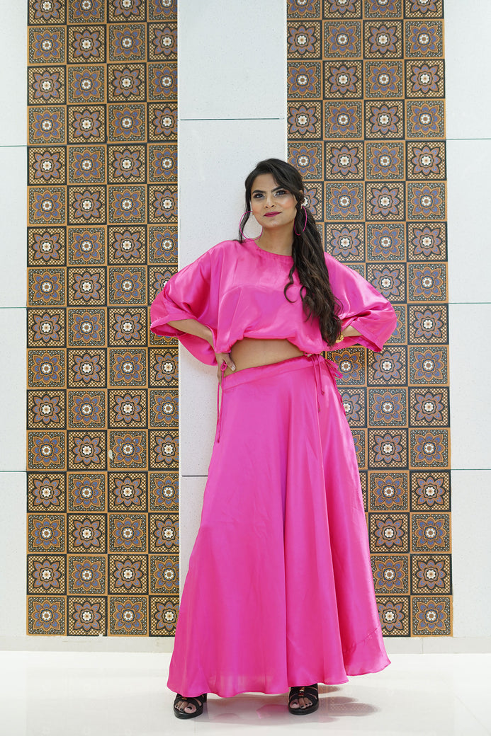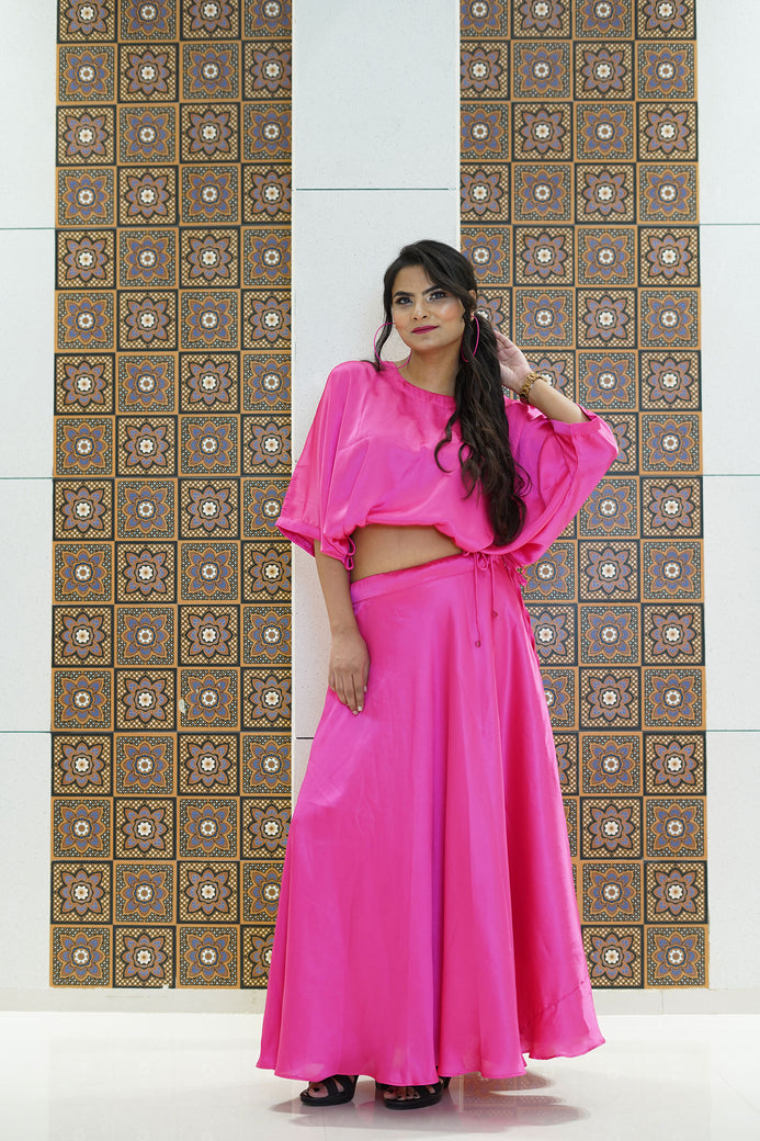 Gathered blouse with Dolman Sleeves and Flared Skirt-Fabric-Satin