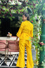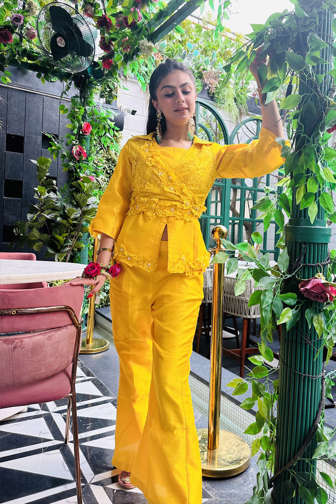 This Yellow 3 pc co-ord set has an overlap crop jacket with beautiful lace patchwork done on top and jacket. This co-ord set is a perfect unique outfit for the Haldi ceremony.