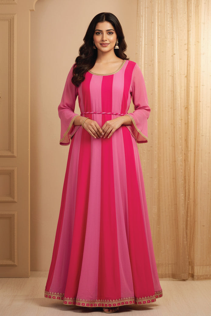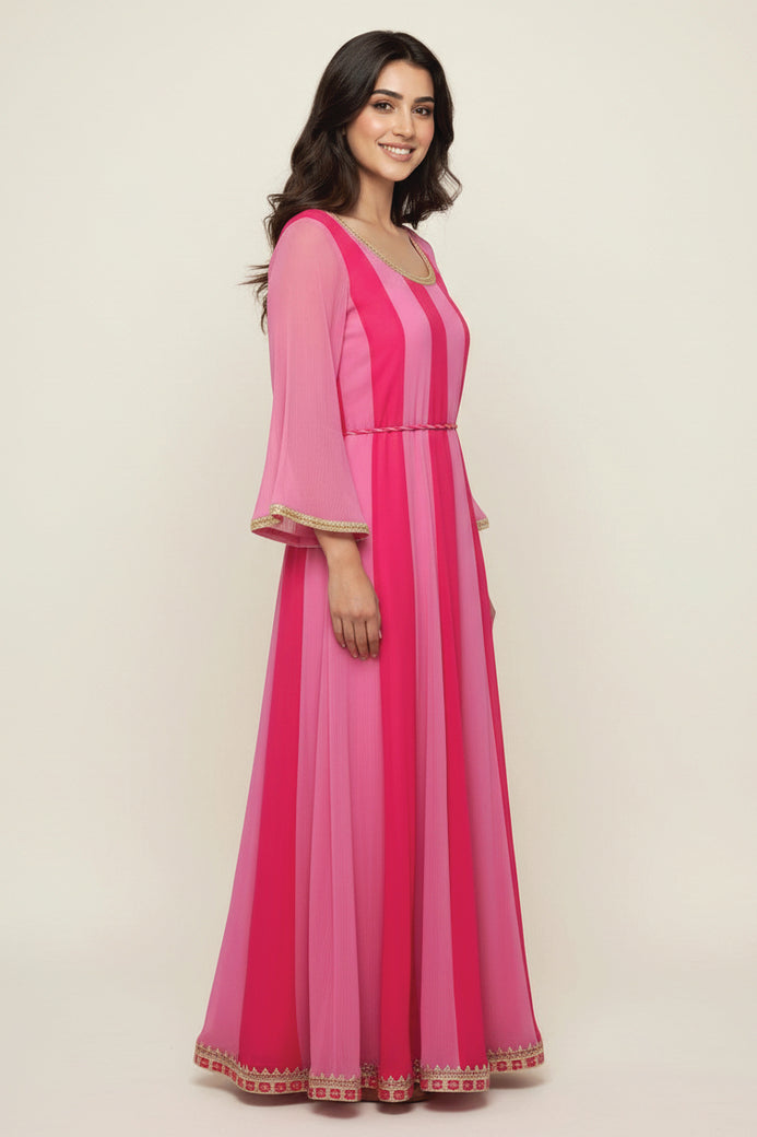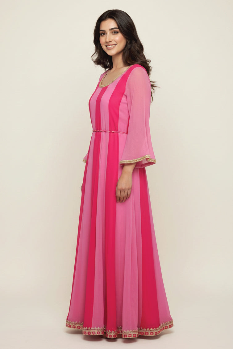 This graceful dual-shade pink gown is crafted in a lightweight, flowy fabric featuring vertical tonal panels that create a visually elongating silhouette. Designed with a soft scoop neckline, the gown is highlighted with subtle gold lace edging.The long sleeves are finished with matching gold lace detailing at the cuffs.A contrast tie-up at the waist with handcrafted fabric tassels allows for an adjustable fit. Finished with a beautifully detailed hemline enhanced by gold lace and subtle embellishment, this gown is perfect for festive gatherings, evening occasions, or elegant celebrations.