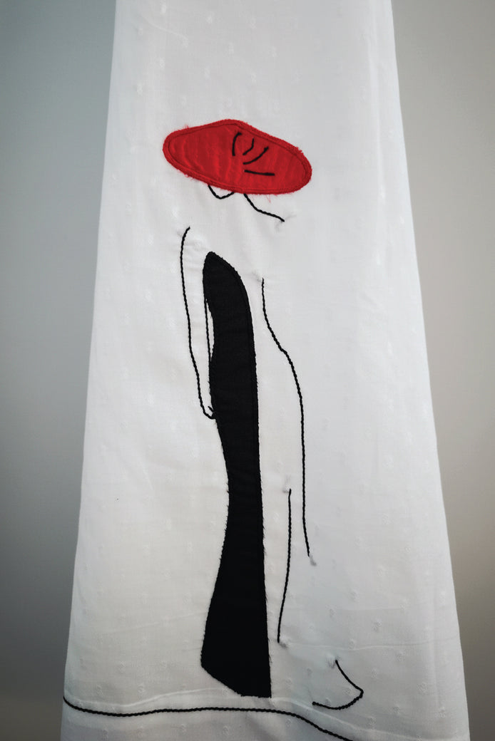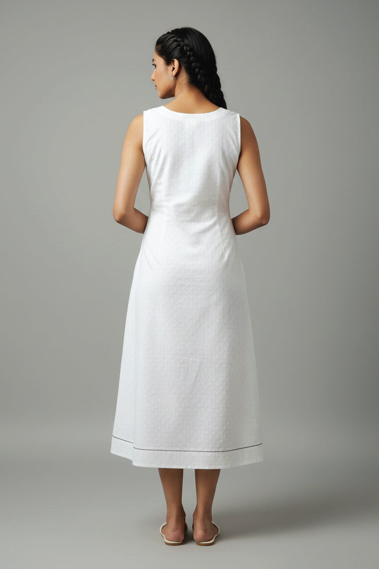 Cotton Dobby White Calf Length Dress with Unique Patch and Thread Work