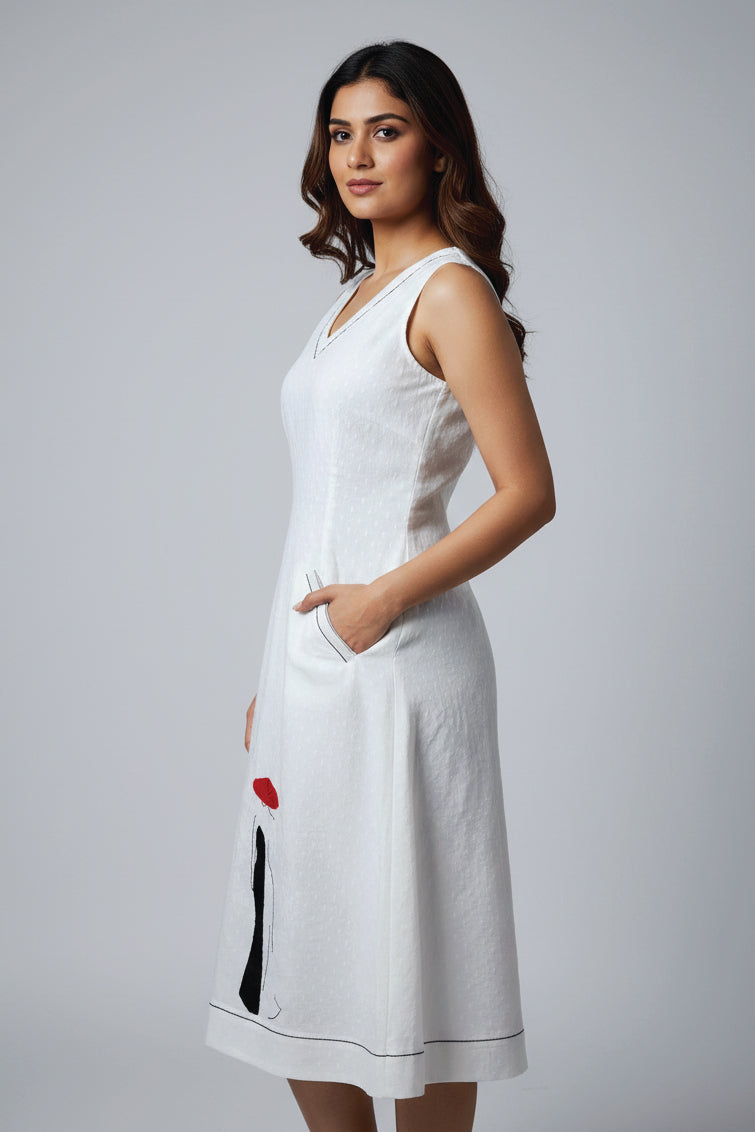 This calf-length dress is crafted in soft, breathable cotton Sleeveless White midi dress featured front pockets,with V shape neck having an unique patch and thread work on it’s front. Stitch lines over the pockets, neck and Hem.
