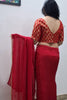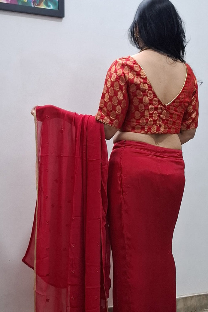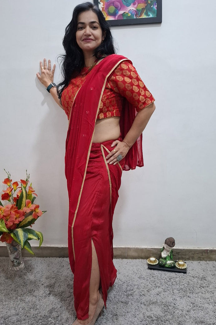 Red Saree Style Skirt with Boat Neck Blouse and Separate Pallu with Work