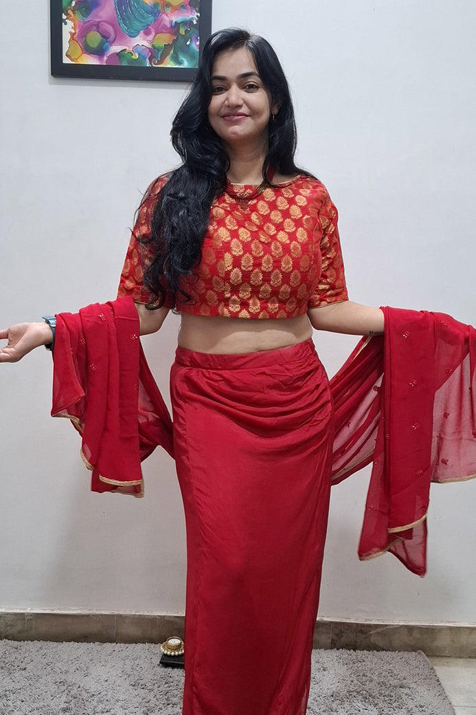 Make a striking entrance with this fusion saree-style set in rich red tones. The look combines a flowing skirt (in saree style), a graceful boat-neck blouse, and a separate pallu adorned with intricate detailing. This set merges the elegance of a saree with the convenience of a skirt set — perfect for festivals, weddings, or special evenings when you want tradition with ease.
