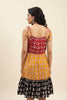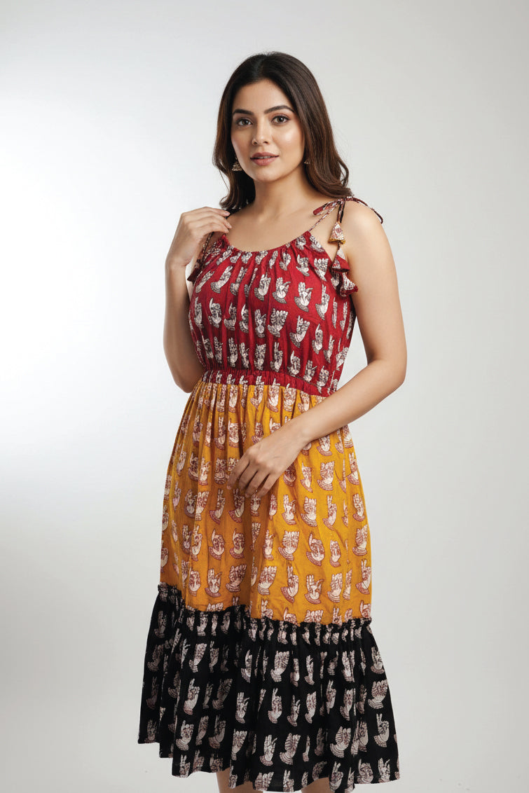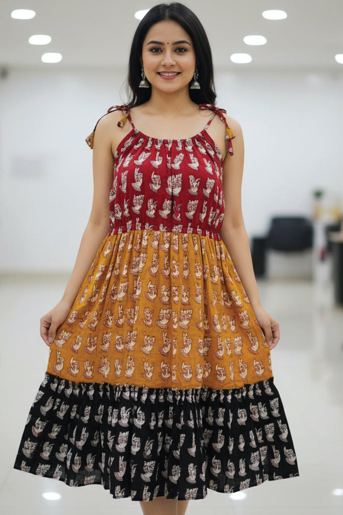 This three-tier dress features a distinctive mudra-inspired handblock print. Crafted in breathable cotton, the dress is thoughtfully designed in three contrasting colours- maroon at the bodice, warm mustard at the mid-tier, and classic black at the hem.The gathered neckline with adjustable tie-up straps with tassels ensures a comfortable. The softly flared, tiered silhouette offers effortless movement and all-day comfort, making it ideal for casual outings, festive daywear, or relaxed cultural gatherings.
