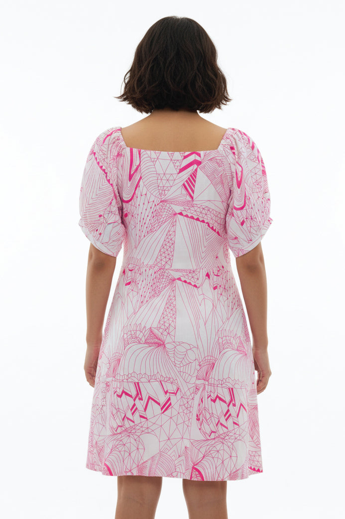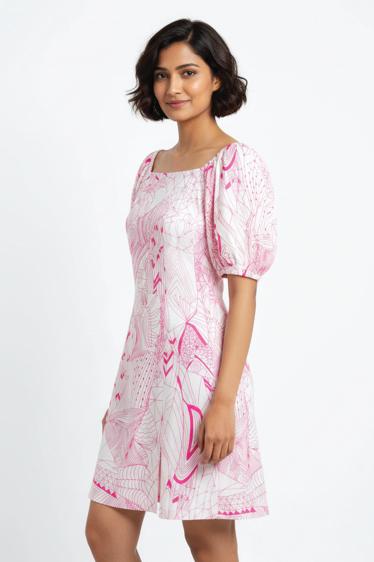 This charming short dress has a modern abstract print. Crafted in soft, breathable fabric, the dress showcases a flattering square neckline and delicate puff sleeves that add a touch of femininity. The thoughtfully designed silhouette is ideal for all-day wear. abstract pattern in soft pink tones enhances its contemporary appeal, it has a fresh and youthful look. Perfect for casual outings, brunches, or relaxed gatherings, this dress effortlessly balances comfort with style. It has a 7” slit at the side front