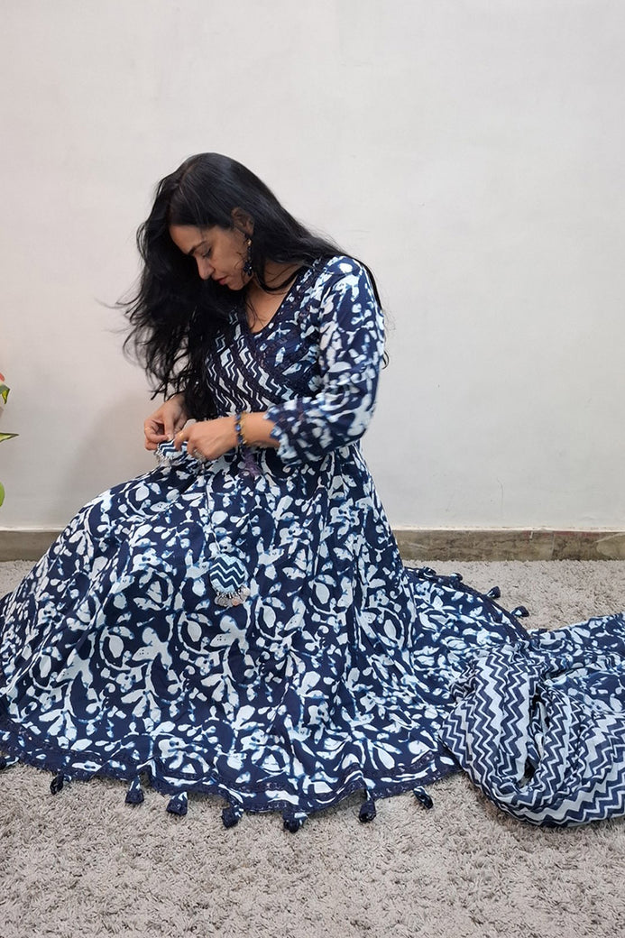 Immerse yourself in the timeless beauty of Bagru craftsmanship with this exquisite Angrakhaa-style suit set, complete with matching pant and dupatta. Lavishly detailed with ornate lace and charming tassels, this ensemble blends tradition and trend for a standout ethnic look.