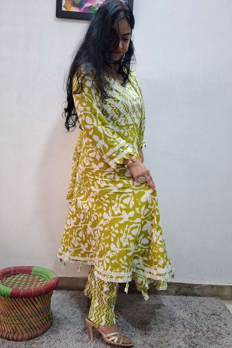 Bagru Print Angrakhaa Style Suit with Pant and Dupatta with Lace and Tassels Detailing