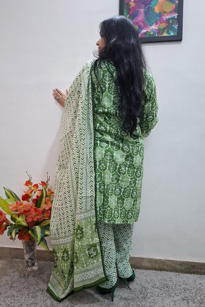 Infuse your ethnic wardrobe with this delightful Bagru print combo — a short kurta enriched with artisan work on the neckline and sleeves, paired with a stylish dhoti bottom and coordinated dupatta. Perfect for festive gatherings, casual celebrations, or diurnal elegance.