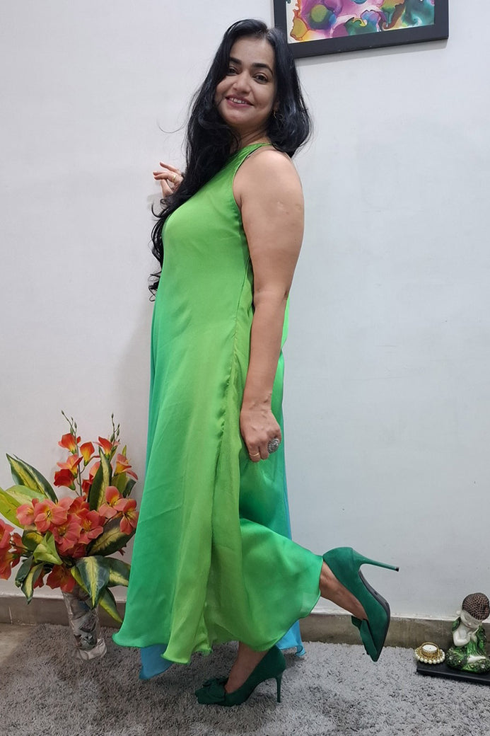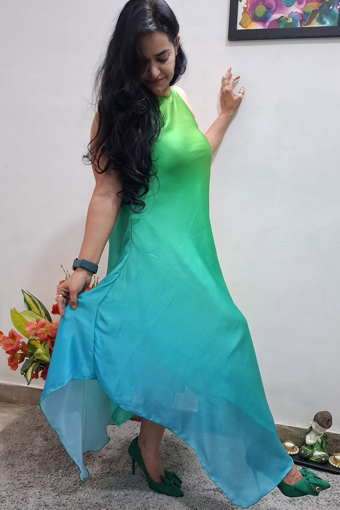 Satin Georgette Asymmetric Hem Peacock Shade Halterneck Dress