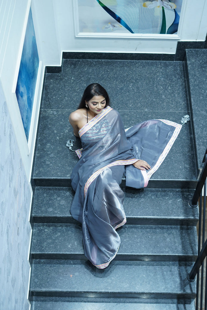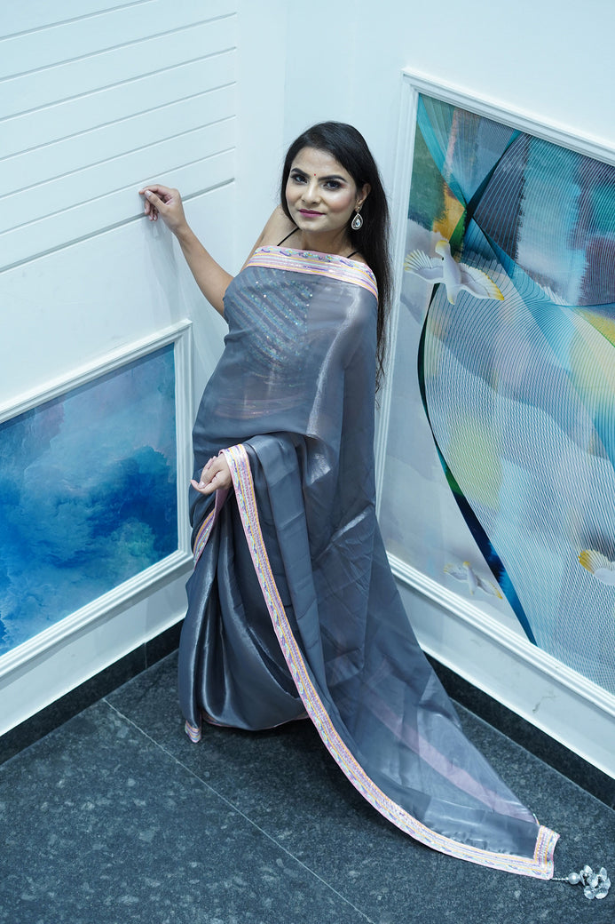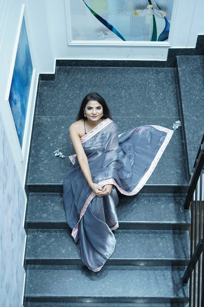 Get a shimmer and glossy look with this designer saree from Chaitasri. It has an embroidered border with tassels in pallu. It’s a great pick for parties and festivals alike.