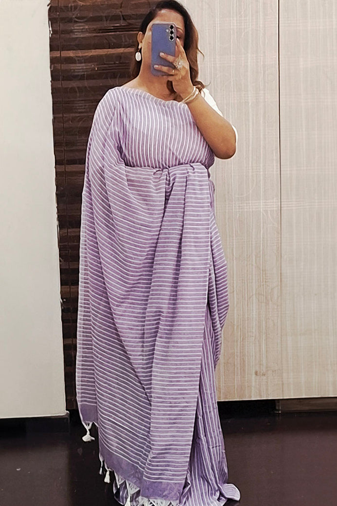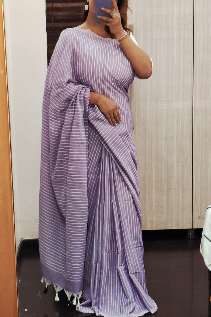 Pastel Sheds Stripes Handloom Cotton Saree with Plain Blouse Piece