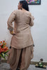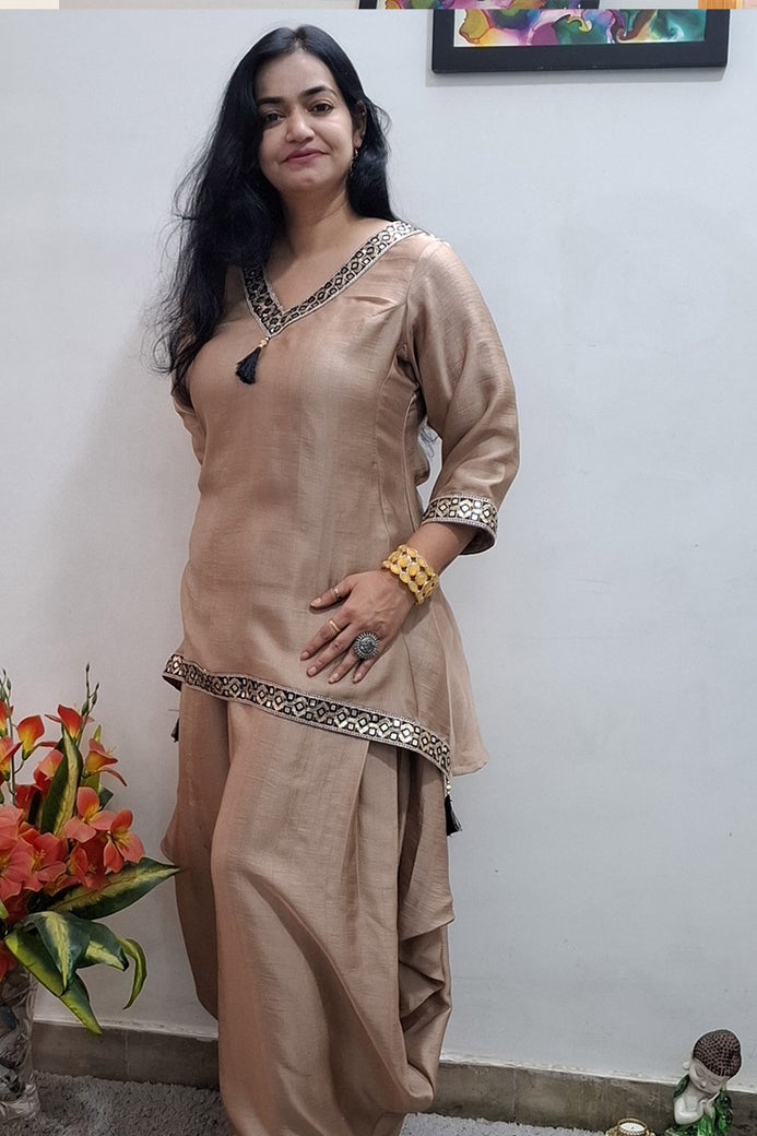 Add some summer style to your wardrobe with this chic three-piece set: a short silk kurti with an asymmetric hem, paired with draped cowl-style pants, all elevated by elegant black lace trim. Designed to combine comfort and sophistication, this set works beautifully for casual outings, evening meet-ups, or light festive occasions.
