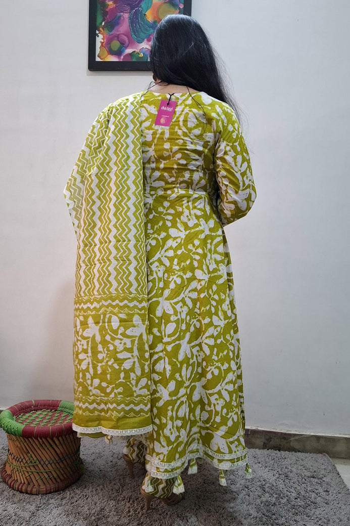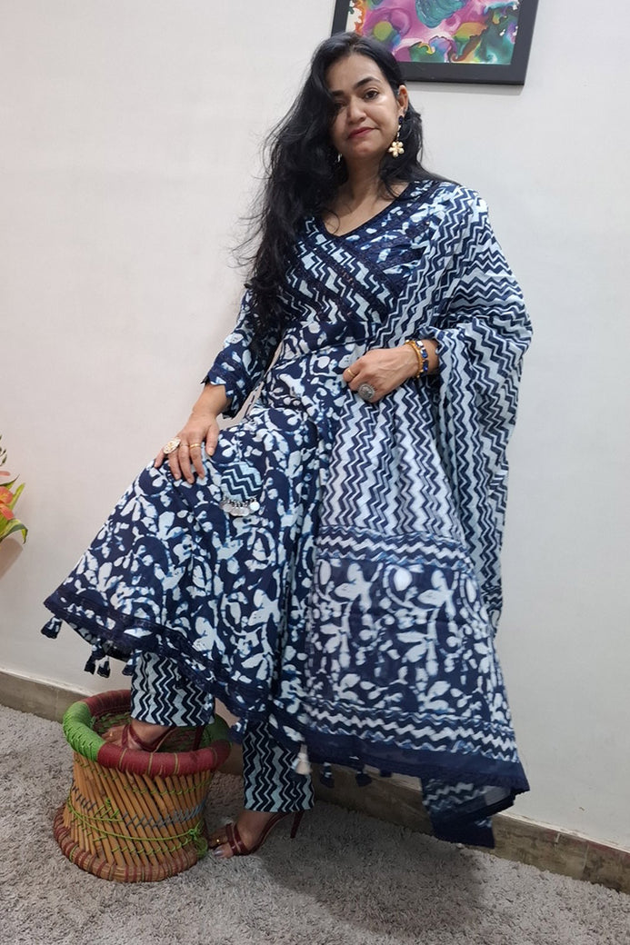 Immerse yourself in the timeless beauty of Bagru craftsmanship with this exquisite Angrakhaa-style suit set, complete with matching pant and dupatta. Lavishly detailed with ornate lace and charming tassels, this ensemble blends tradition and trend for a standout ethnic look.