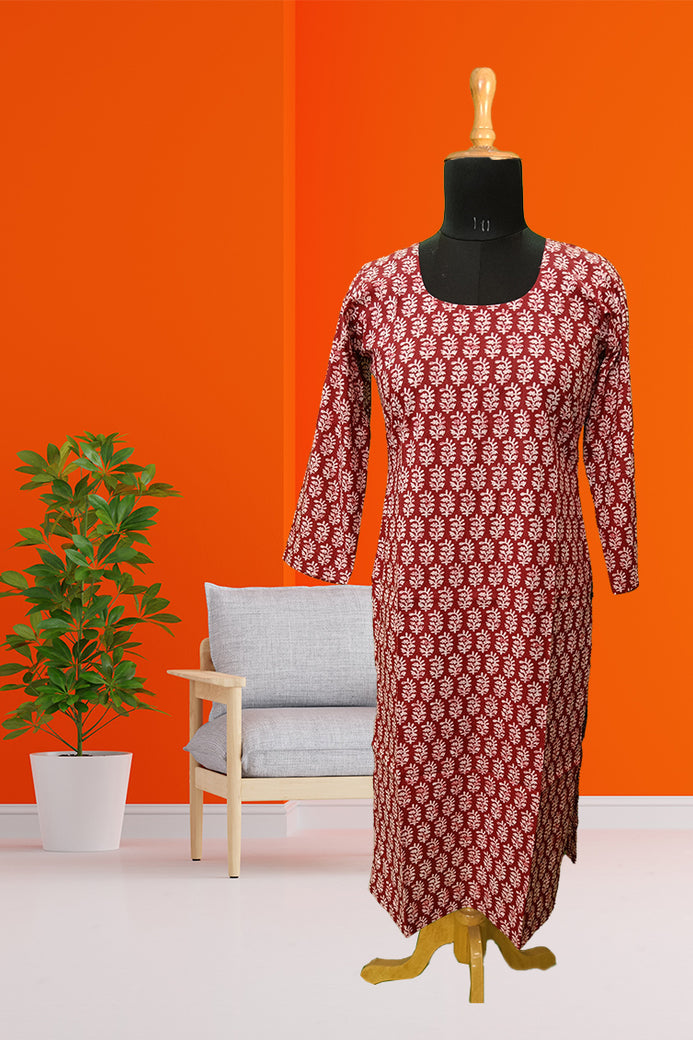 Make style your fashion statement with this unique Maroon Bagru Print Kurti. This attractive and comfortable kurti is sure to set you apart in the crowd.