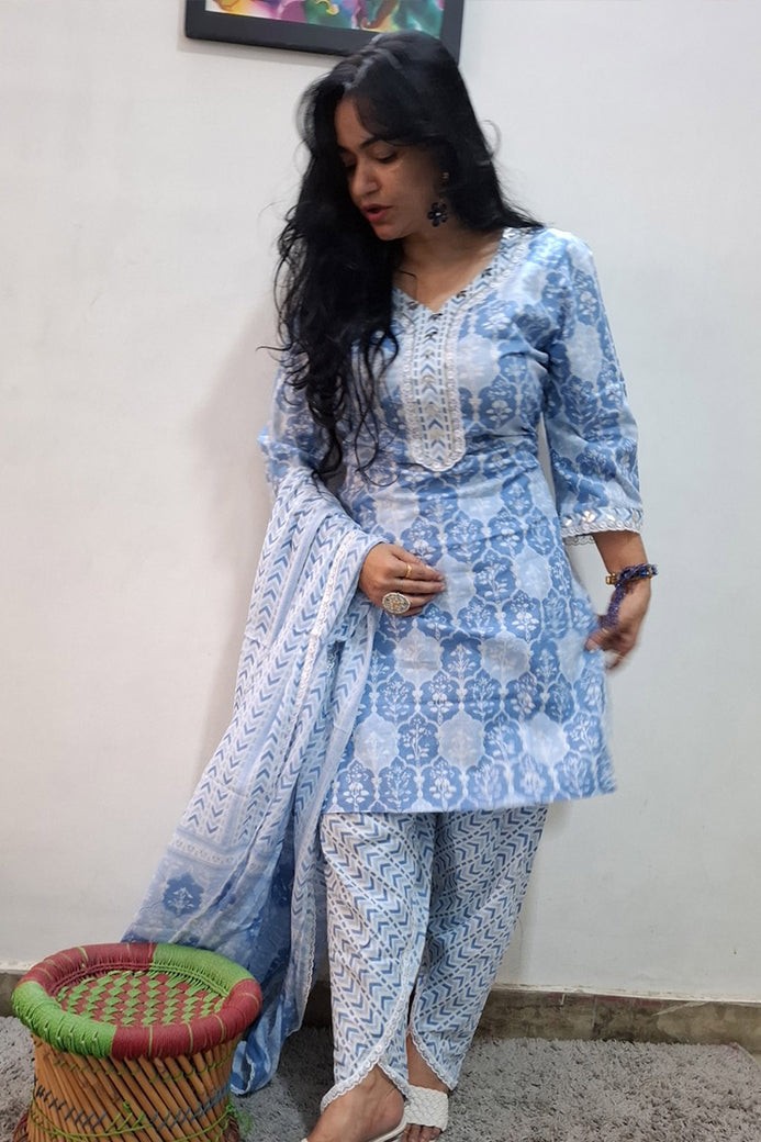 Bagru Print Short Printed Kurta with Work on Neck and Sleeves with Dhoti and Dupatta