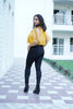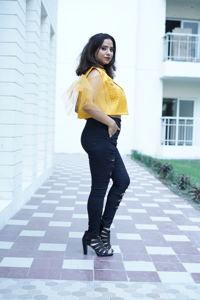 Make a cool and casual addition to your style with this yellow coat collar crop shrug by Chaitasri. Pair it with trendy jeans t-shirt