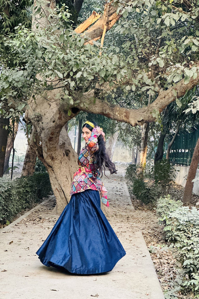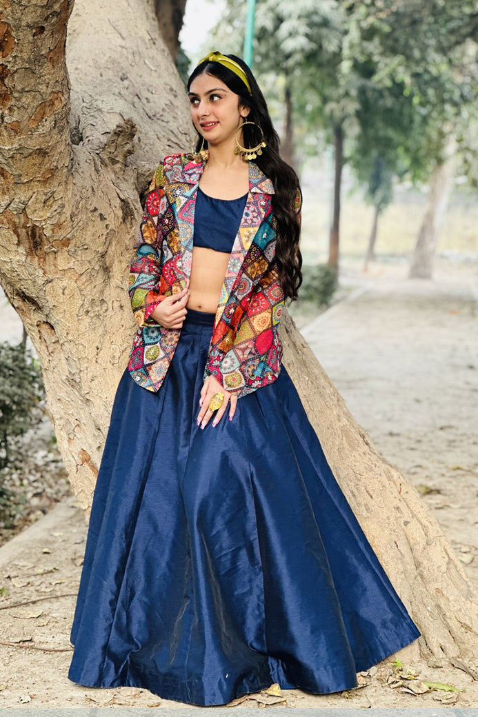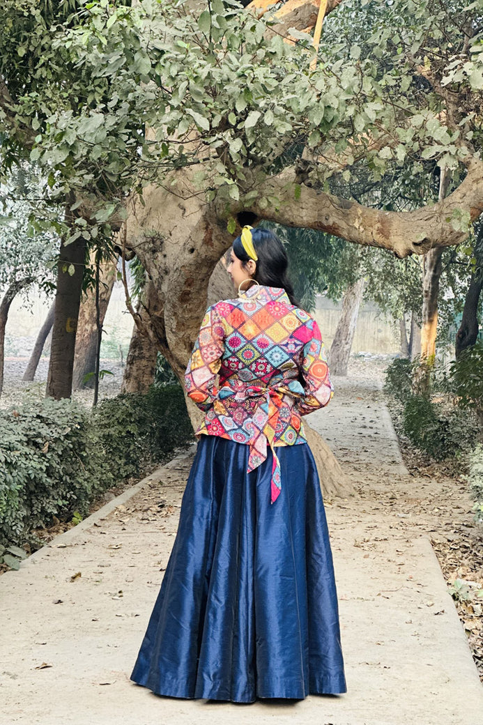 Navy Blue Skirt, Crop Top With Cape Fabric: Dupion Silk